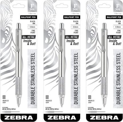 3 – Zebra F-701 Ballpoint Pens, Stainless Steel with Knurled Grip, Pk of 3 Pens